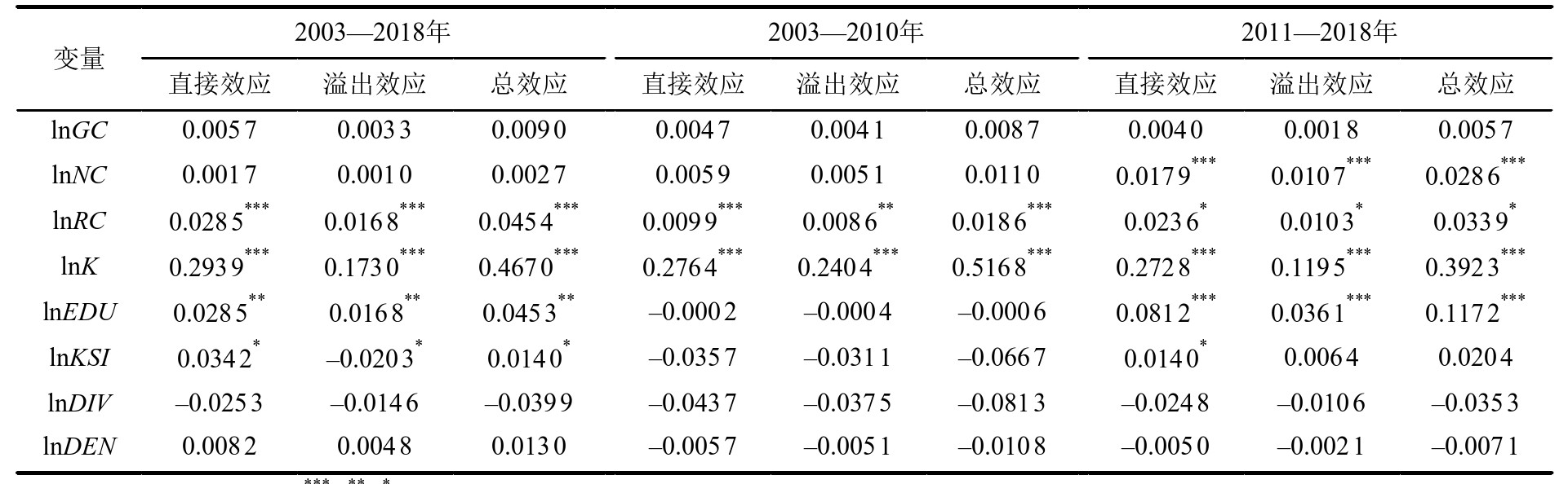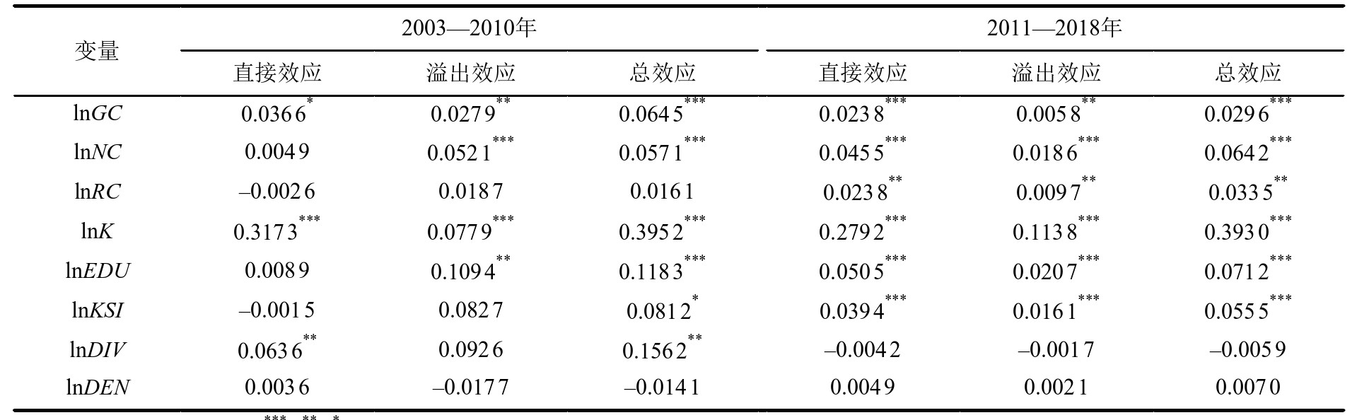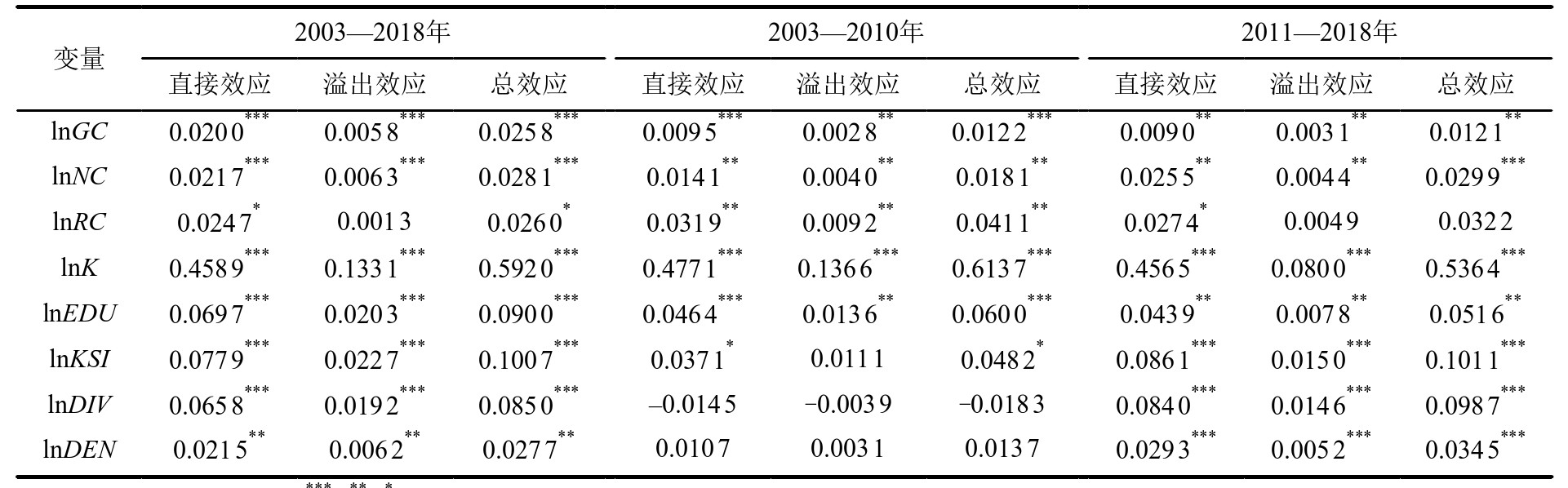 通过检验判断可知,2003—2010年和2011—2018年的最优拟合模型分别为具有固定效应的SPDM和SPLM。因此,基于SPDM和SPLM分别对2个时段进行回归分析。2个时段上空间项的估计系数ρ和σ2均为正且都通过了1%水平上的显著性检验,表明均存在显著的空间溢出效应。