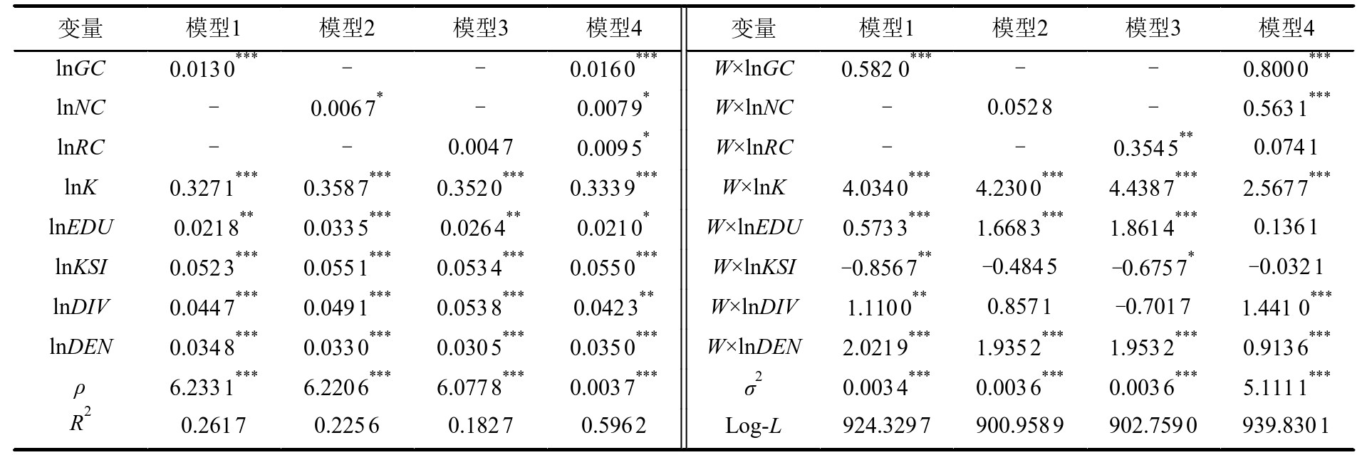 模型4结果显示,在控制了其他变量的前提下,全球、全国和区域尺度综合中心性的回归系数均为正值,3者均通过了至少0.1水平下的显著性检验。这表明,长三角地区的城市通过嵌入到不同尺度的城市网络之中,可以享受到超越地理边界的网络外部性,凸显出城市的比较优势和规模经济,从而对城市经济增长产生积极的影响。此外,在空间权重矩阵W作用下,空间交互项W×ln GC、W×ln NC的系数均显著为正,表明全球和全国网络嵌入均存在显著的空间溢出效应;W×ln RC的系数虽不显著但也呈现出正向的影响。最后,模型中大部分控制变量的直接项和相应的空间交互项也通过了显著性检验。