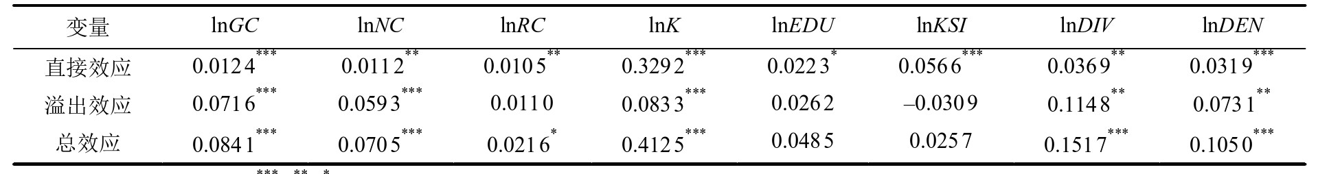 就控制变量而言,城市的资本存量、人力资本、专业化集聚、多样化集聚和城市化集聚等因素均对本市经济增长产生直接的促进作用。其中,城市的资本存量越高,越有利于资本的深化,进而有助于其经济增长;且随着教育水平的提升劳动力素质得到改善,专业化人力资本的不断积累使得生产函数表现出规模报酬递增,从而对经济增长产生推动作用。集聚外部性变量组中3个变量的直接效应均显著为正,这意味着流动空间环境中集聚经济仍是影响城市经济增长的重要因素,空间约束下的产业集聚所带来的外部性和知识溢出效应是经济地理景观演化过程中不可忽视的驱动力量。此外,资本存量、多样化集聚和城市化集聚的空间溢出也是显著提升城市经济绩效的重要途径。
