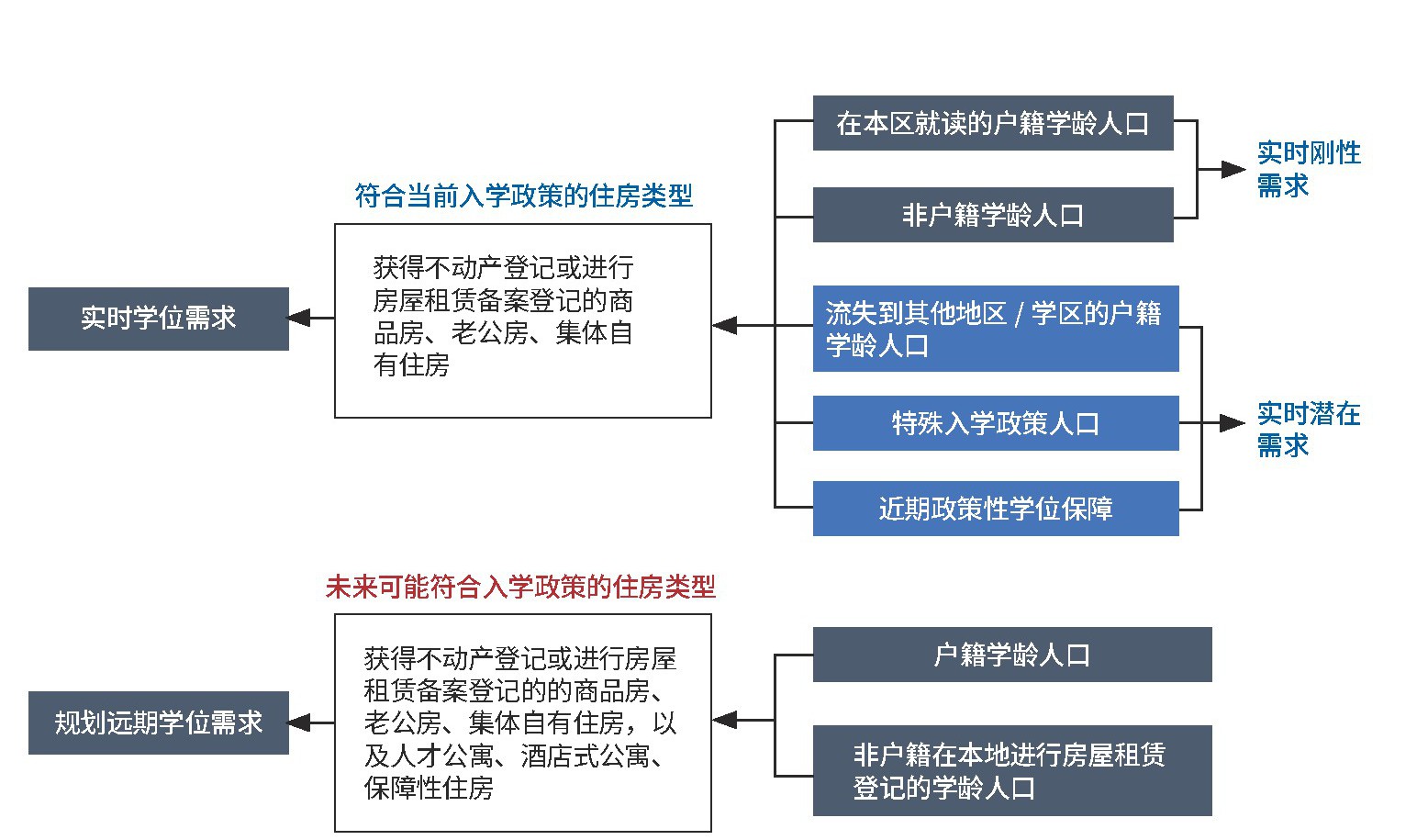 在普陀区的调研中,发现符合当前入学政策的实时服务人口主要由公安部门登记的户籍人口和住房租赁备案的居住人口构成。这些人口产生的学龄人口和学位需求,即实时学龄人口和实时学位需求。见图2。