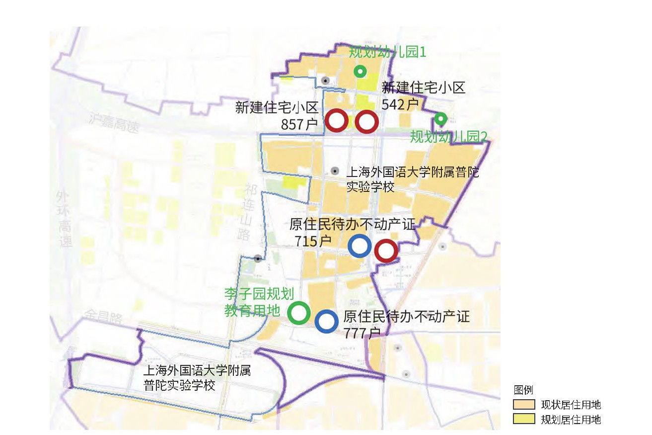 例如,华东师范大学附属外国语实验学校目前拥有两个规模较小的校区。在本次规划中,依托普陀区“十四五”规划中的绿地世纪城学校项目,对华东师范大学附属外国语实验学校的两个校区进行整合,通过扩大单所学校的规模来提升学校空间品质。华东师范大学附属外国语实验学校原有的两个校区空间,则可以作为邻近的两所小型幼儿园的迁址扩建选址。这两个幼儿园的原址可以在深入论证后,或作为基础教育资源的备用地,或改造用于其他公共设施和社区公共服务设施建设。