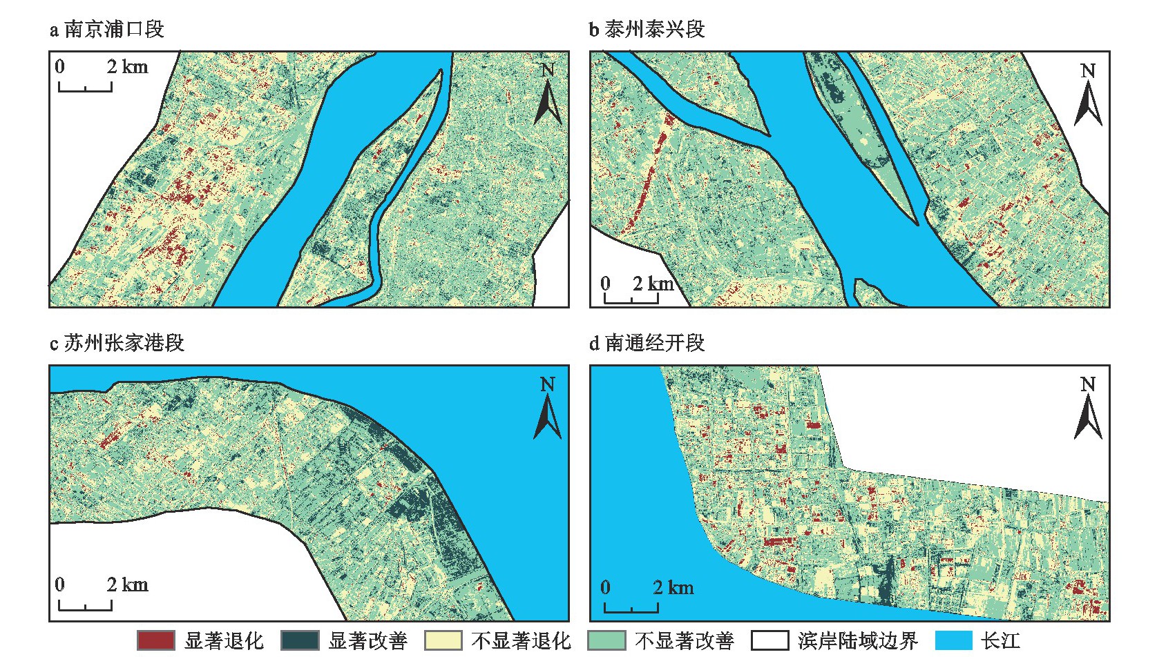 植被覆盖改善的区域占非生态转生态用地的74.80%,其中植被覆盖显著改善的区域仅占非生态转生态且植被改善区域的23.10%,集中分布于长江江苏段沿线,特别是南京浦口、雨花台及八卦洲段已被清退码头(图3c)、扬州仪征段已被整治港口、苏州张家港段围滩等区域,表明港口码头的清退整治工作导致非生态用地向生态用地转化使植被覆盖状况得到一定的改善。植被覆盖不显著改善的区域与显著改善的区域分布较为一致,上述被清退整治的港口码头区域多呈现局部显著改善、整体不显著改善的植被动态趋势,经遥感比对后发现,港口码头被清退后留存的硬质化地面导致植被覆盖状况难以显著改善。非生态用地转生态用地的区域同样出现较为分散的植被退化状况,相对集中分布于常州段新北区码头清退区域(图3d)和新孟河延伸拓浚工程区域,这反映了由非生态用地向生态用地转变中的人为干扰往往会引起植被覆盖阶段性下降的现象。
