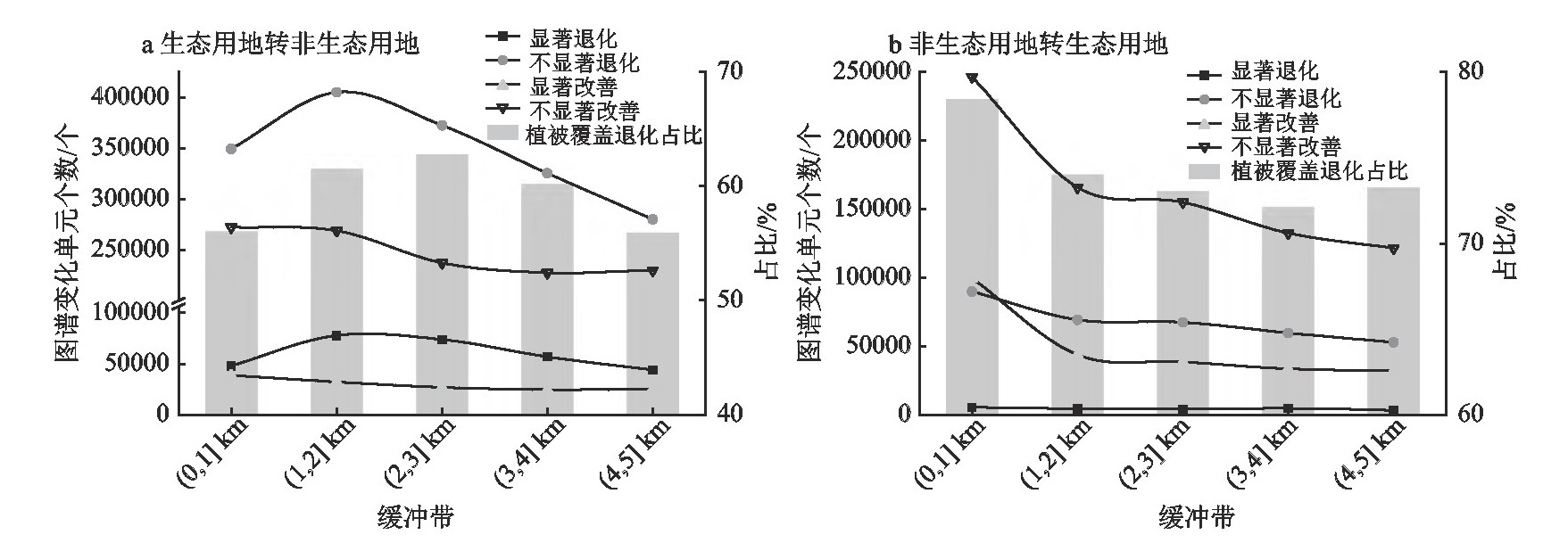 从生态转非生态用地和非生态转生态用地两个方向对土地利用和植被覆盖响应图谱的缓冲带差异进行分析。如图4a所示,生态用地转非生态用地的区域,(1,5]km缓冲带离岸越近,生态转非生态用地且植被退化图谱单元个数与占比越高,(1,2]km缓冲带生态转非生态用地且植被退化图谱占比最高(61.62%),由城镇、工业用地扩张引起的植被覆盖退化响应在(1,2]km缓冲带表现最为明显。至(0,1]km缓冲带内植被退化图谱占比有明显回落(56.11%),植被退化趋势较(1,2]km缓冲带弱。生态转非生态用地区域也出现一定的植被改善的现象,所处缓冲带离岸越近植被覆盖改善的图谱占比越高,(0,1]km缓冲带内植被改善的图谱占比最高(43.89%),植被改善现象最显著。如图4b所示,非生态用地转生态用地所在缓冲带离岸越近,植被覆盖改善的响应越明显,植被覆盖改善图谱单元个数随缓冲带离岸距离减少而增加。(0,1]km缓冲带植被覆盖改善的图谱占比其他缓冲带更多(32.43%),植被覆盖改善现象最显著,植被退化对非生态转生态用地的响应更明显。