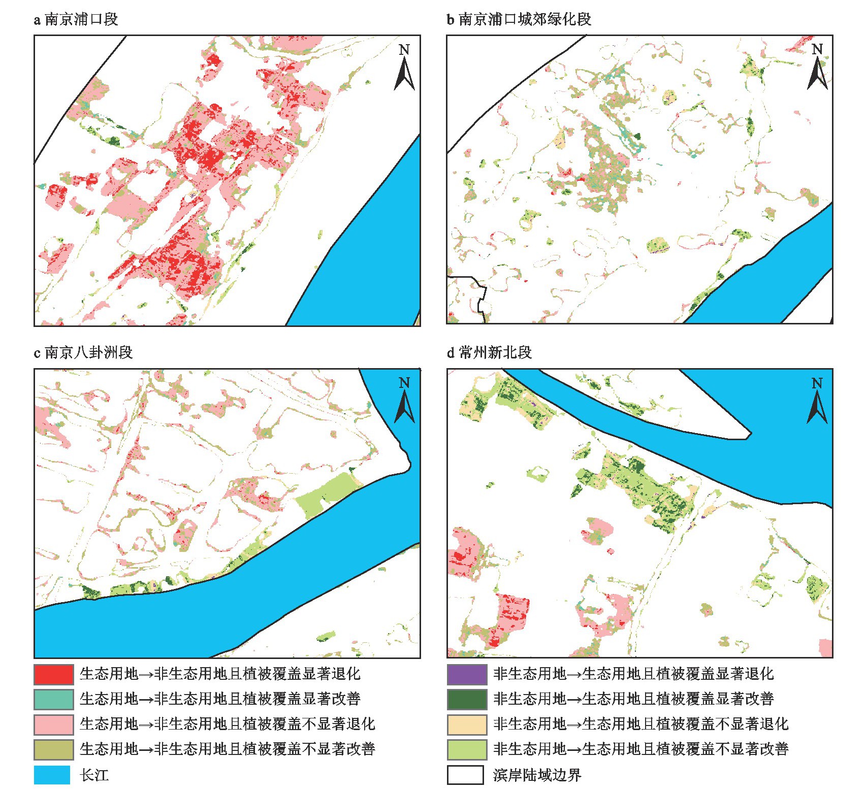 研究表明,植被覆盖对生态用地转非生态用地整体呈现不显著退化的响应趋势。植被覆盖退化的区域占生态转非生态用地的59.51%,其中植被覆盖显著退化的区域占比不高,仅占生态转非生态用地且植被退化区域的14.78%,集中分布于南京浦口段新增城镇用地(图3a)、扬州仪征及邗江段产业园、镇江京口段新增港口仓库及泰州泰兴段化工园区等区域,表明城镇用地扩张引起的生态用地转非生态用地使植被覆盖发生一定程度的退化。由生态用地转非生态用地的区域出现了植被覆盖改善的状况,这一类图谱单元分布较为分散,主要表现为城镇扩张中城镇绿化工程带来的植被覆盖改善(图3b)。研究区植被覆盖对非生态用地转生态用地整体呈现不显著退化的响应趋势,非生态用地转生态用地且植被覆盖不显著改善图谱占比17.00%。