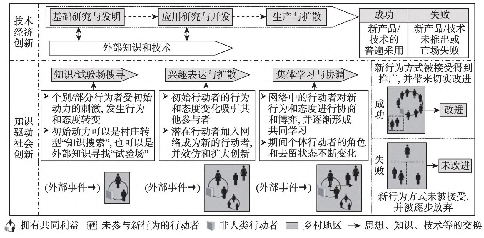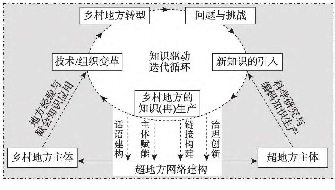 本文从中国乡村发展面临的现实困境入手,系统梳理乡村发展范式演进规律,并融合新内生发展、社会创新等相关概念,尝试提出一种更符合中国实际的知识驱动乡村转型发展的创新路径。本质上,“知识驱动”是通过科学知识或经验在乡村地区的生产、传播、反馈和再生产等,吸引不同主体参与知识创新行动,共同建立乡村发展解决方案,推动乡村发展转型的过程。由乡村内部或外部主体为解决具体问题或转变地方发展观念而激发社会创新的初始动力,推动在广域范围进行知识或试验场搜寻,构建创新驱动乡村地方发展问题解决的新话语体系。新话语体系通过赋权初始行动者和利益表达与兴趣扩散,吸引更多主体参与拓展创新网络和集体行动,促进更迭乡村地方经济社会发展的技术路径,推动乡村社会的系统性变革,实现可持续发展。需要强调的是,搭建超越乡村地方的网络链接,促进乡村地方内外多元主体针对发展问题的互动学习与行动协调,是诱导知识驱动乡村发展转型实践的关键。