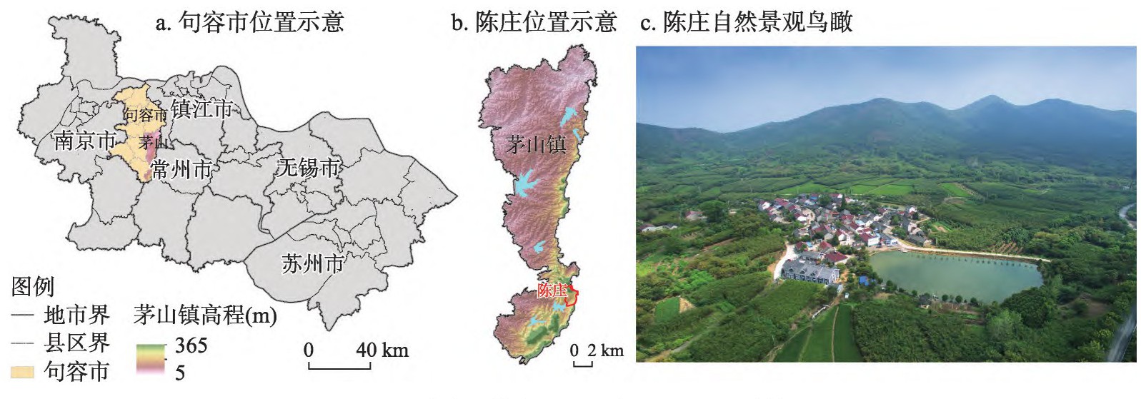 陈庄是江苏省句容市茅山风景区管委会李塔村下辖的自然村,地处茅山山脉的九龙山深处,属于太湖流域上游水源涵养区,周边自然生态环境本底优良,是苏南地区少有的能“望得见山,看得见水”的自然村落。过去10年陈庄通过内外生力量链接知识驱动实现了乡村生态、绿色、可持续转型,在富村民的同时也富了生态,给乡村带来由内而外的持续发展动力,彰显了知识乡村在中国语境下的适用性。如图4所示,陈庄及周边农田和山体总面积约215 hm2,农田、水塘与森林交叉错落,具有完整的浅山生态系统。2014年全村农户80户,户籍人口267人,超过34%的村民外出务工;人口平均年龄42岁,拥有小学、初中、高中及以上学历的村民占比仅分别为13.8%、9.4%和3.4%。