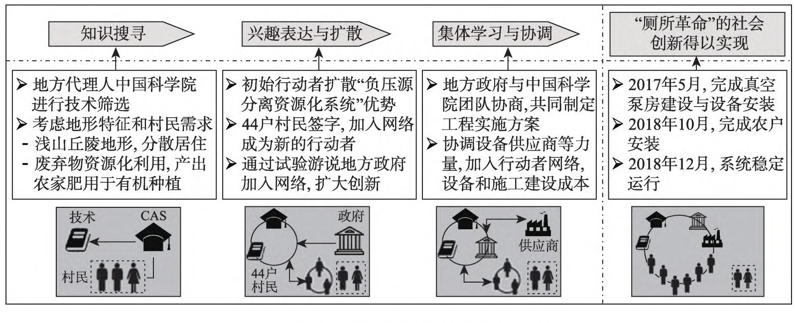 为彻底解决生活污水问题和消除健康隐患,同时为后续资源化利用奠定基础,科研团队结合陈庄住户分散特点开始新一轮技术筛选,并经过充分调研和社区参与反馈,于2016年8月13日在村民大会通过采用“负压源分离资源化系统”的“厕所革命”技术。如图6所示,作为乡村地方代理人的科研团队除前期的技术筛选外,还凭借与村民前期建立的互信关系宣传技术方案的优势(可实现粪尿、餐厨垃圾、秸秆的协同处理,并产出有机肥料用于自然农法种植),并获得44户村民签字支持,从而扩大行动者网络。与此同时,科研团队采用科研经费投入的试验方式,打破地方政府对既有技术的路径依赖,最终获得地方政府认可并作为关键行动者加入网络。最后,地方政府与科研团队经过多次协商制定具体的施工方案,并共同协调设备供应商等各方力量加入行动者网络,降低设备和施工建设成本,村民承担施工及后续维护工作,实现创新网络的社会扩张。在此过程中,科研团队实现了从乡村地方代理人(跨界者)到初始行动者,再到网络协调者等系列身份的转变;地方政府也从技术监管者和潜在行动者转变成为关键行动者和创新促进者;村民志愿者从创新效仿者成长成为示范者和引导者。