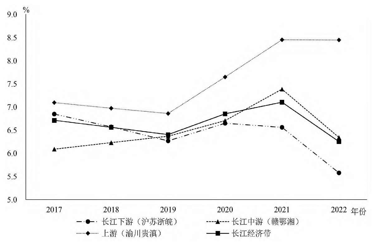 地方政府是区域发展和治理的决策主体,并且以纵向与横向的条块行政体制进行资源配置,与市场机制之间存在相互作用的关系。比如,地方政府拥有大量国有企业,掌握这些国有企业的利益分配权利,相互之间往往形成了复杂的利益联盟,对区域分治下的地方保护和行政分割产生了强化作用,从而导致了“一些地方在实际工作中出现圈地盘、抢资源、条块分割、无序竞争的情况,还存在抢占发展资源、缺乏协作精神、破坏产业链条的连接和延伸等问题”(1),这对利润率增长产生了不小的负面影响。图4是2017年以来长江经济带制造业平均利润率变化情况。从图中可以看到,长江经济带制造业的平均利润率呈现波动下降的趋势,特别是2021年以来,长江中下游地区制造业平均利润出现了较大幅度的下降。解决上述问题的关键,其实在于推动进一步全面深化改革,“聚焦构建高水平社会主义市场经济体制,充分发挥市场在资源配置中的决定性作用,更好发挥政府作用”(2)。因此,推动长江经济带区域协同融通发展首先要处理好政府与市场之间的关系,使二者相辅相成、相互促进、互为补充。一方面,要聚焦打破地方保护和行政分割,通过地区间利益协调、共享与分配机制以及地区间合作、援助与扶持机制等多种形式的制度创新(3),激励地方政府从现有小尺度地方保护行为向大尺度区域协同融通发展思维转变。另一方面,要在有为政府进行制度创新的基础上,借助有效市场的价格、供求、竞争、分工等机制,促进要素在区域间自由流动和高效配置,推动长江经济带上中下游各区域实现协同增长。