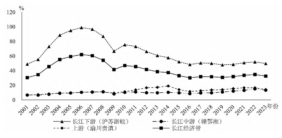 长江经济带在过去的工业化进程中,主要依靠嵌入发达国家主导的全球价值链进行生产代工,因而属于典型的外向型经济。随着我国经济发展格局转换为以国内大循环为主体、国内国际双循环相互促进的新发展格局,基于国内市场的内向型经济将在区域经济运行中发挥更多的战略性作用。图5是2001年以来长江经济带的对外依存度变化情况。从图中可以看到,我国从加入世界贸易组织到国际金融危机前的一段时期,是长江经济带对外依存度最高的时期,特别是长江下游的长三角地区,经济外循环占据主导;而在国际金融危机之后,长江经济带对外依存度不断下降,经济内循环的地位不断上升。实际上,长江下游的长三角地区基本上处在工业化后期向后工业化过渡的阶段,生产性服务业发展规模和速度均比较可观,而长江中上游地区在整体上仍处于工业化中期的加速发展阶段,生产制造成本具有比较优势。这样,围绕长江经济带可以构建起一个由下游地区主导、中上游地区嵌入的国内价值链体系,从而带动整个区域经济内循环畅通,推动长江经济带的区域协同融通发展。然而,这种分析是从理论上进行推演,需要严格的假设前提。其中一个关键的假设就是,长江经济带沿江各地区具有市场化、法治化、国际化营商环境,并且生产要素可以在各地区间自由流动。唯有如此,产业链才会从长江下游地区向中上游地区进行梯度转移。