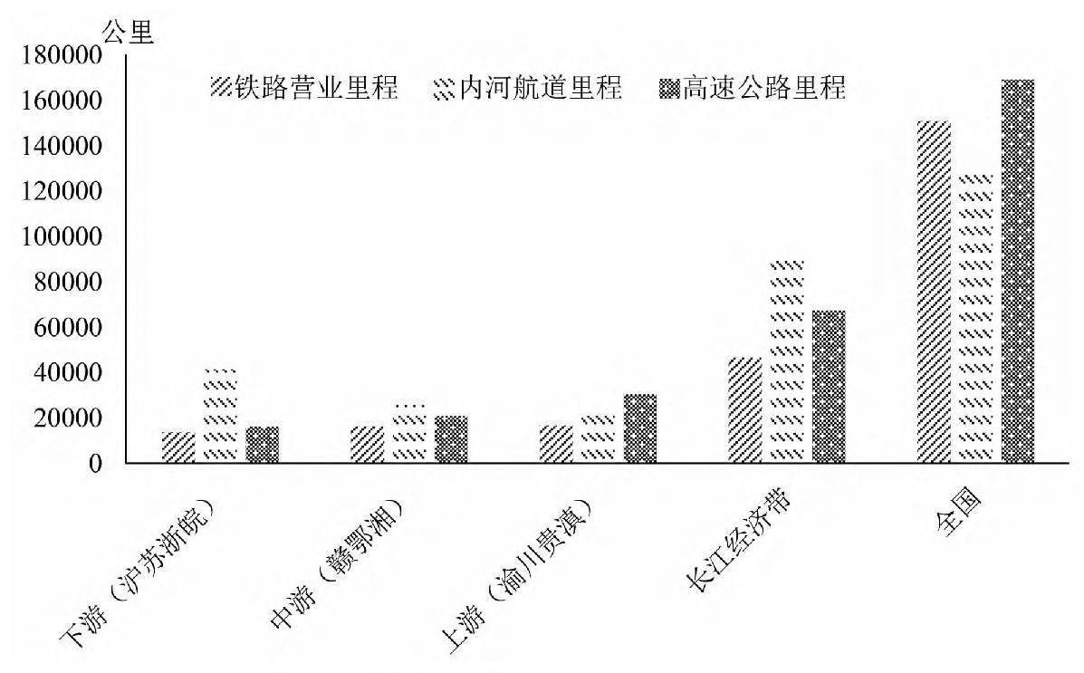 要素禀赋是长江经济带区域协同融通发展的基础性条件。它不仅是指自然资源禀赋及其分布,还包括劳动、资本等社会资源禀赋及其结构。一方面,长江经济带基于长江流域而形成,跨越了东中西三大地带,各地自然资源禀赋、地理环境等相对独立且难以改变,属于典型的“第一自然”特征(1)。这就决定了长江经济带上各个省份之间的差异,也形成了客观存在的区域市场地理边界和市场范围,并演化出了独特且稳定的地域经济和文化类型。根据第三次全国文物普查,长江经济带所在的11省(市)现有不可移动文物30.6万余处,包括全国重点文物保护单位1872处、世界文化遗产13处、国家历史文化名城59处(2)。另一方面,从劳动、资本等社会资源禀赋及其结构来看,长江经济带内部各个省份之间其实有着很强的依赖与制约关系,表现为基于“第二自然”的经济活动在区域空间上的辐射和扩散。比如物流、人流、资金流和信息流在长江经济带上中下游各省份之间的交流互动,进而产生区域外溢效应,打破区域市场地理边界,推动长江经济带的区域协同融通发展。图2是2021年长江经济带交通网络里程情况,从中可以看到,长江经济带在我国交通网络布局中占据重要的战略地位(铁路、内河航道和高速公路里程占全国比重分别为30.88%、71.13%和39.86%),有利于在国内大循环的经济空间格局中发挥“黄金运输带”的关键作用。但是,这种要素市场的区域刚性的打破,需要以区域分治下地方保护和行政分割的消除为前提。
