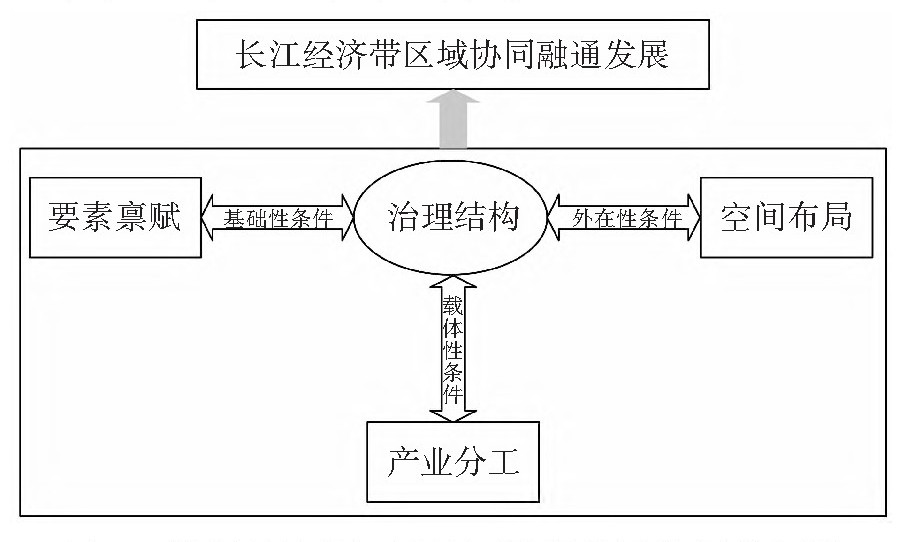 长江经济带区域协同融通发展就是指长江经济带上中下游各省市之间通过相互开放和合作,不断消除各类阻碍区域协调发展的显性或隐性壁垒,以形成要素共享、风险共担和价值共创的区域发展共同体。其中,关键在于打破区域分治下的地方保护和行政分割,即通过体制机制创新,激励地方政府跳出区域分治博弈形成的“囚徒困境”。这也是我国区域经济运行中的独特特征。鉴于此,本文尝试构建以地方政府治理为核心,以要素、产业、空间为支撑的区域协同融通发展理论逻辑(见图1),为推动长江经济带区域协同融通发展进而构建区域发展共同体提供学理基础。