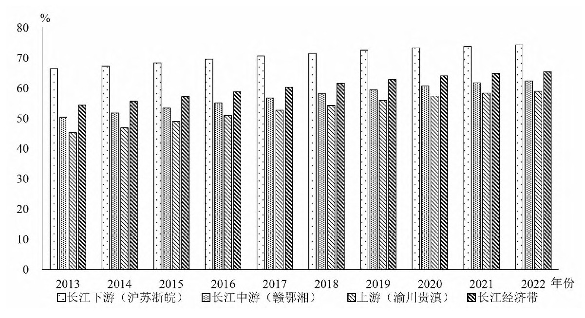 空间布局是长江经济带区域协同融通发展的外在性条件,强调通过资源配置实现对国土空间的有效、公平、协调和可持续开发利用。例如,基础设施和公共服务等公共投资的区域协同布局,已成为促进区域增长、缩小区域差距的重要因素。图3是2013—2022年长江经济带常住人口城镇化率变化情况。从图中可以看出,2013年以来,长江经济带整体的城镇化率呈现持续上升的良好态势,尽管长江上中下游地区城镇化水平存在梯度差异,但这种差异正在逐步缩小。按照党的二十届三中全会报告提出的“健全现代化基础设施建设体制机制”要求,基础设施和公共服务等公共投资要实现协调建设和融合利用。这意味着在城市群内部以及城市群之间形成真正的空间网络联通,即基础设施协调布局、公共服务共享、生态共建环境共治等。Meijers等(1)的研究指出,空间网络联通性的存在,往往使得城市网络外部性能够对大城市集聚外部性产生重要的补充效应,因为中小城市的网络嵌入和空间联通导致了对大城市的规模借用过程,从而弥补自身规模不足。长江经济带“一轴、两翼、三极、多点”的空间格局,正是对这种空间网络联通性的有效回应,但其政策效果往往受制于地方政府治理水平。综上,以地方政府治理为核心,以要素、产业、空间为三大支撑的长江经济带区域协同融通发展理论框架,有利于清晰地认知区域协同融通发展的内在逻辑,对长江经济带区域协同融通发展的长效机制构建和政策路径重塑具有较强的启示性。